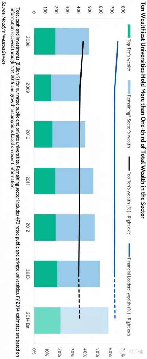 这是美国大学财富表,从图中可以看出,虽然经历经济波动,但顶尖的十所大学财富,稳定的占据着1/3的比例。