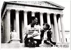 我讲个故事,去更好得阐明“leading out(引导出来)”这样一个好的想法。一个美国的联邦大法院,前边坐着两个人,一个是4岁的黑人小姑娘,一个是她的母亲。他们很高兴地举着这张报纸,上面写的字是:最高法院今天禁止了在中学里面发生的种族隔离制度。这张照片拍于1956年,在那一年小姑娘想去自己社区里面的白人学校被拒绝。因为当时白人学校和黑人学校是不能混合的。