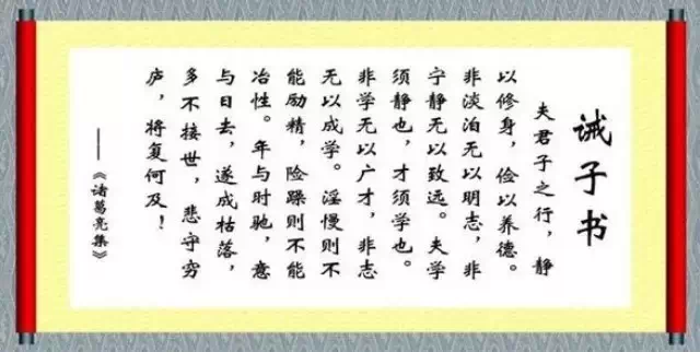 静以修身、非宁静无以致远、学须静也。诸葛亮忠告孩子宁静才能够修养身心,静思反省。不能够静下来,则不可以有效的计划未来,而且学习的首要条件,就是有宁静的环境。现代人大多数终日忙碌,你是否应在忙乱中静下来,反思人生方向?
